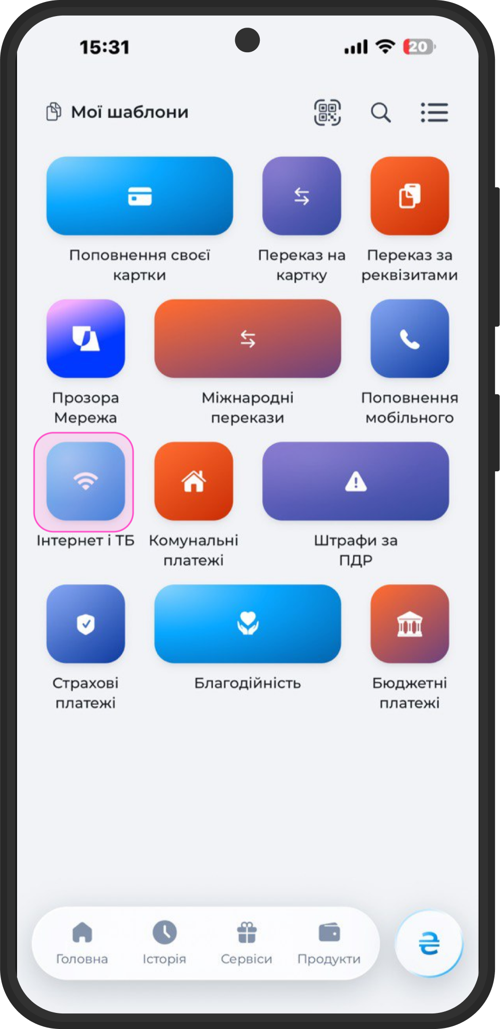 У меню сервісів, що відкриється, знайдіть та натисніть на іконку «Інтернет і ТБ».