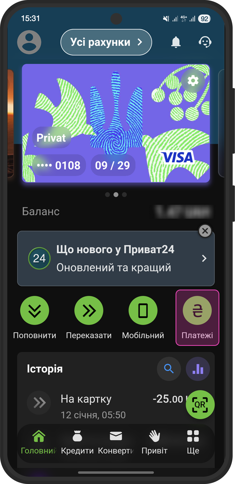 Запустите приложение Приват24 на своем смартфоне. На главном экране найдите и нажмите на кнопку "Платежи" (она выделена фиолетовой рамкой в средней части экрана).