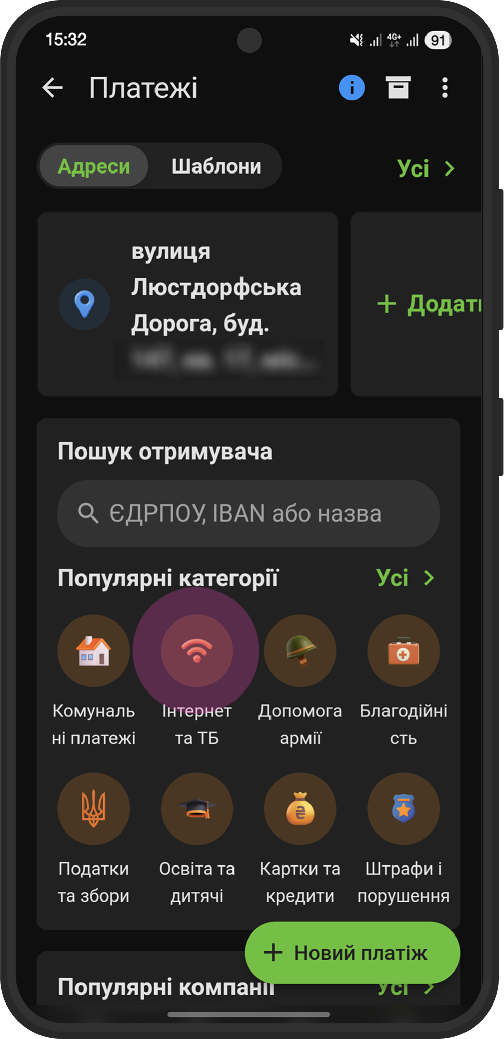 На экране с популярными категориями нажмите на иконку "Интернет и ТВ" (обозначена значком Wi-Fi). Если вы не видите эту категорию сразу, воспользуйтесь поиском получателя.