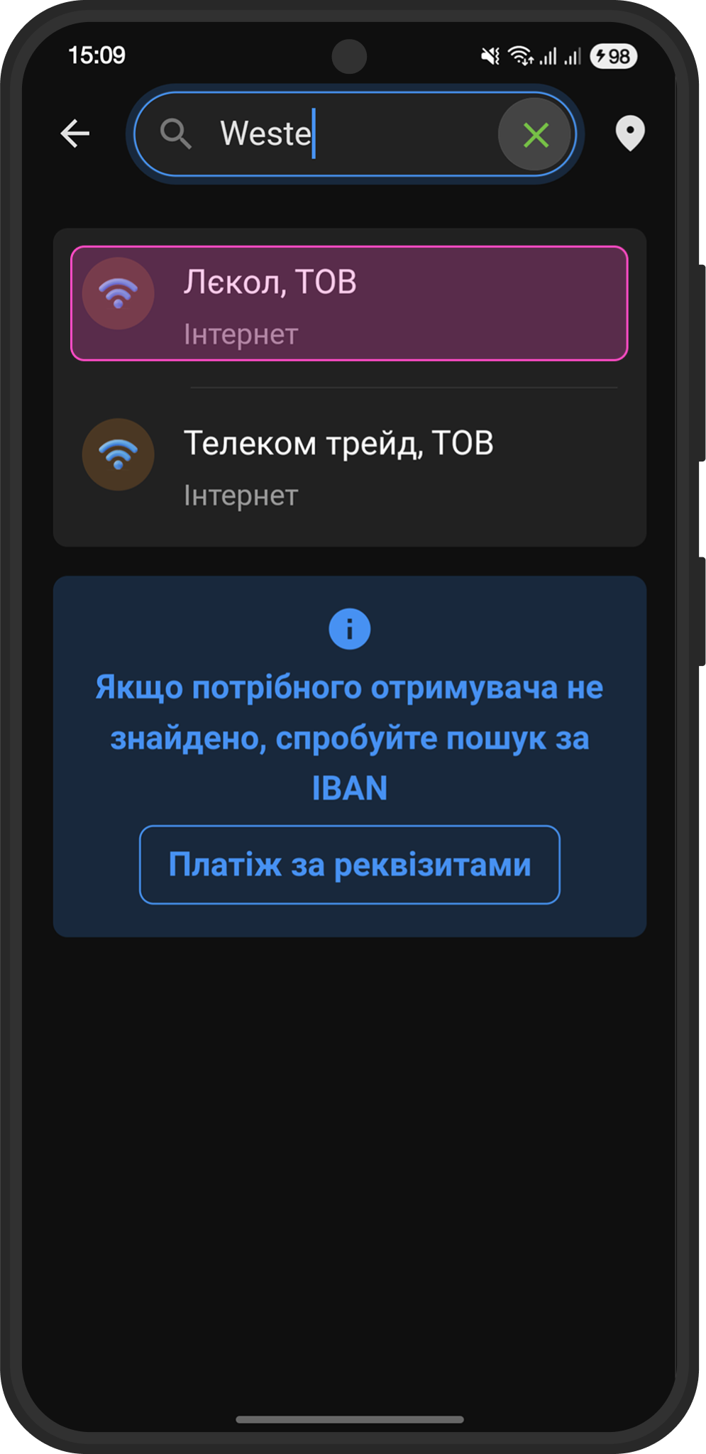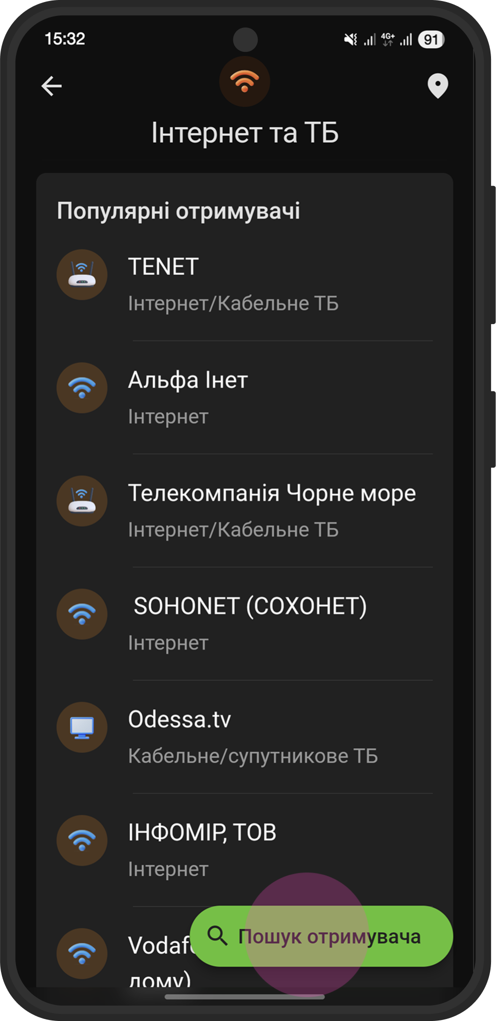 В разделе "Интернет и ТВ" вы увидите список интернет-провайдеров. Нажмите кнопку “Поиск получателя”.