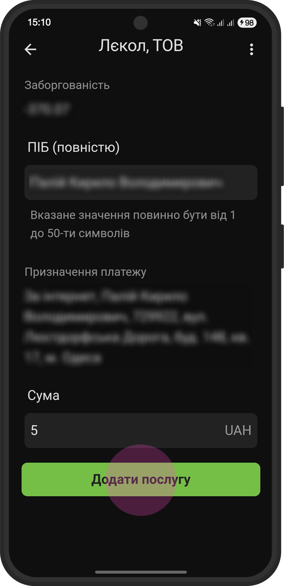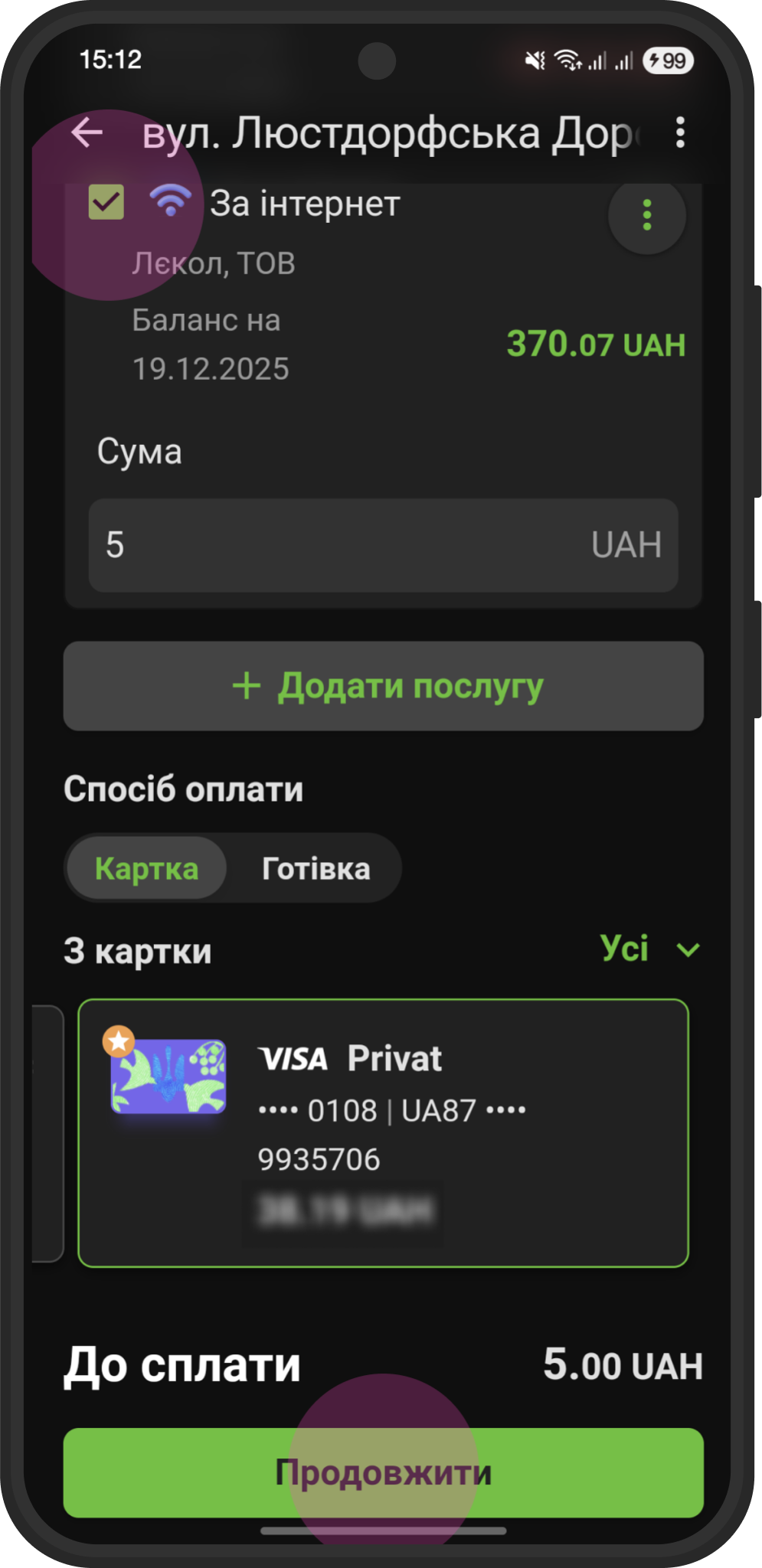 - Сумма платежа: например 5.00 UAH (или ваша сумма)