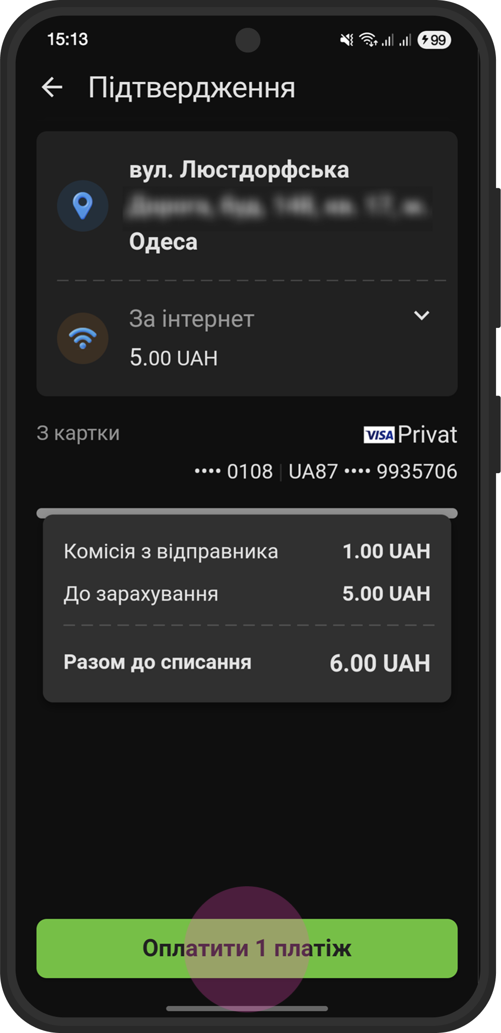 Итого к списанию: 6.00 UAH (платеж + комиссия)