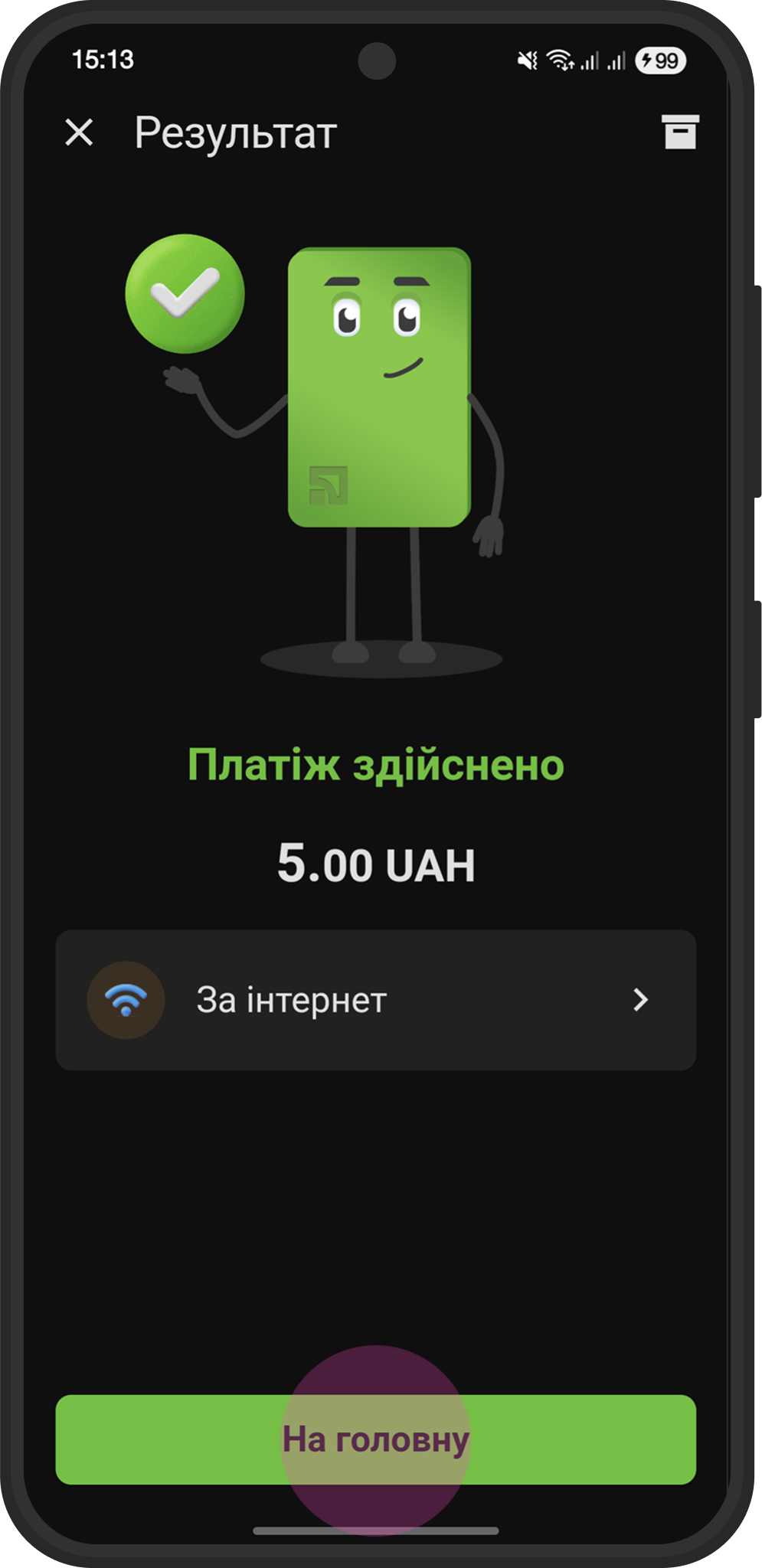 Нажмите зеленую кнопку "Оплатить 1 платеж" внизу экрана.